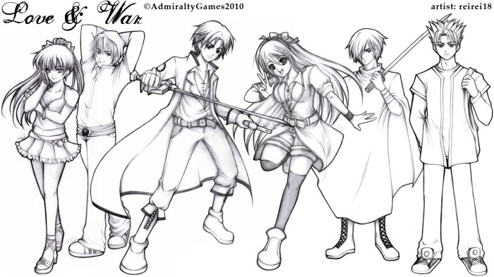 I was working on 2 other game projects at school, commissions and other excuses. I understand that I volunteered coz I didn’t imagine that it’d be a terribly busy year so I really appreciate Admiral for all the patience.. gaah… In the end, I only finished coloring 4 characters after knowing my partner, King-sama, will do the coloring for the game art and background. Nevertheless, I did my own presentation for the 4 characters I colored: